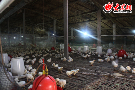 老支書帶著我們來到李付喜的雞棚前。雞棚有兩個(gè),一大一小。老支書進(jìn)到較小的那個(gè)雞棚去看,里面什么也沒有。這時(shí)李付喜從對(duì)面較大的雞棚中走出來。李付喜今年30歲,他告訴記者,自己這兩個(gè)雞棚一個(gè)60米長(zhǎng),11米寬;一個(gè)40米長(zhǎng),11米寬。大的雞棚里現(xiàn)在養(yǎng)著12000只小雞,等這些小雞長(zhǎng)大一些,就分一部分到小的雞棚里,F(xiàn)在這些小雞才剛9天大。