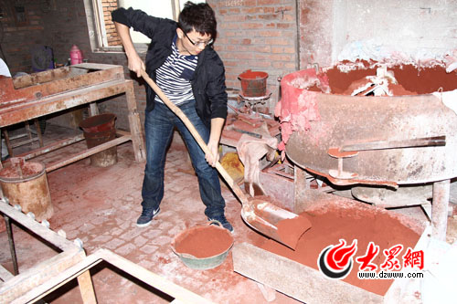 攪拌底料更是一項(xiàng)技術(shù)活兒了。攪拌機(jī)中泥沙滾滾,攪拌機(jī)外飛塵漫漫,記者們靠近一點(diǎn)就不自覺地閉眼遮面,好一會(huì)才適應(yīng)過來。負(fù)責(zé)該環(huán)節(jié)的劉師傅說,底料的成分包括了細(xì)砂、白水泥和氧化鐵紅。其中白水泥的作用起膠結(jié)作用,而我們熟悉的磚紅色則是氧化鐵紅的妙處所在了!包S色磚塊里面用的是氧化鐵黃,”他說:“制磚的關(guān)鍵在底料,而底料的關(guān)鍵在水量!奔铀坑绊懼ùu的濕度和黏度,更關(guān)系到道路是不是結(jié)實(shí)耐用。