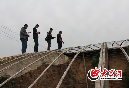 記者們跟隨李新業(yè)主任爬上一間溫棚的頂部,李主任向記者介紹起溫棚的結(jié)構(gòu)