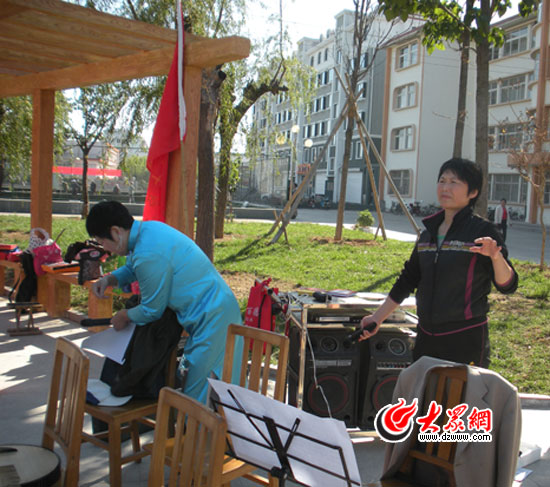 上午8點30分,記者來到老干部活動中心前的廣場,離節(jié)目開始還有半小時,廣場上文化活動“慶九九‘幸福的日子開心過’”的橫幅已經(jīng)掛好。一位正在準備的大娘告訴我,“李局正在那邊忙著呢”,順著手指的方向,我看到一身黑色運動服,白色運動鞋裝扮的李局長正在為節(jié)目忙碌著。
