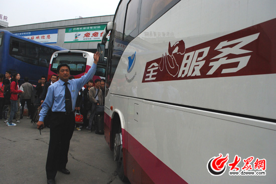我心里暗自打鼓,人還能有多少啊,再忙,連接受采訪的時間都沒有?為了不耽誤事兒,還是定了早上5點的鬧鐘,起床洗刷完也沒吃早飯就出了門。不到5點半,天才蒙蒙亮,路燈都還亮著,行人還很稀少,“到了汽車站也就6點,應該晚不了!蔽倚睦锵胫,可是沒想到到了地方才發(fā)現(xiàn)自己錯了,早上6點鐘,濟南長途汽車總站就已經是人山人海,大廳里人挨著人,到處都是提著大包小包準備外出的行人。外面發(fā)車區(qū)的車輛,更是一輛接著一輛,穿梭不斷。就在人群和車輛之間,張傳滿正一只手拿著對講機,一只手比劃著引導車輛行進。