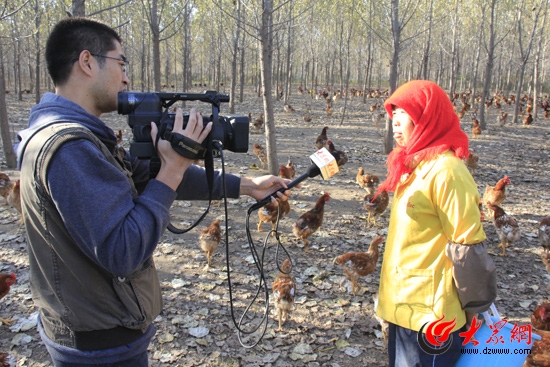 大眾網(wǎng)走基層問民生采訪小組記者韋輝在經(jīng)濟林下采訪養(yǎng)殖戶孫立強夫婦(曹亮 攝)