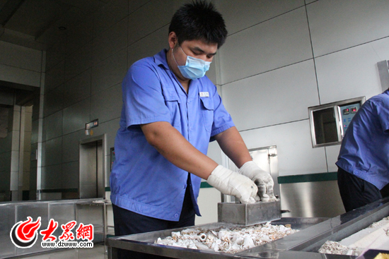 這時,隨著火化爐上提示音的響起,今天被送來的第一位逝者的遺體已經(jīng)火化和冷卻完畢。大眾網(wǎng)記者跟隨著小丁走到火化爐前,隨著爐門的打開,一股熱浪撲面而來,瞬間讓人有窒息的感覺。而小丁和同事卻不顧上這些,開始用工具在耐火板上收集逝者的靈骨。