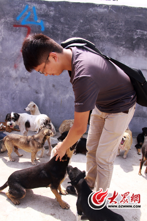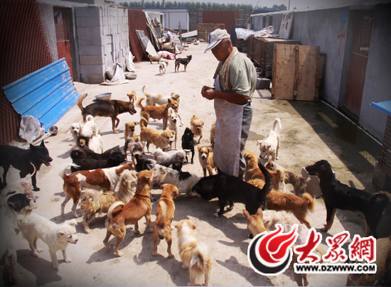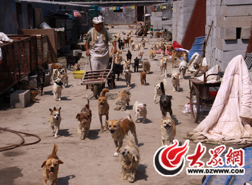院子的門口,三四個工人正將一塊刻著“泰山小動物保護中心”字樣的石碑豎在門前。推開大門,三四只小狗搖著尾巴圍了過來,在記者腳邊嗅來嗅去。而放眼望去,小院的四周全是磨著水泥的狗舍,陌生人的進入,引得全院子數(shù)千只狗齊吠!安挥门,這些狗光叫不咬人!闭郎蕚湮构返内w大叔在四、五十只只狗的簇擁下,把記者帶進院子。