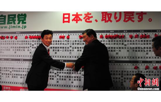 12月16日進(jìn)行投票選舉的日本第46屆眾議院大選,雖然最終選票結(jié)果要于17日凌晨統(tǒng)計(jì)完畢,但自民黨單獨(dú)獲得眾議院半數(shù)席位已經(jīng)意味著將重新執(zhí)政,而自民黨總裁安倍晉三將成為日本新首相。圖為自民黨干事長石破茂在給獲選議員貼獲勝標(biāo)志紅花。中新社發(fā) 孫冉 攝