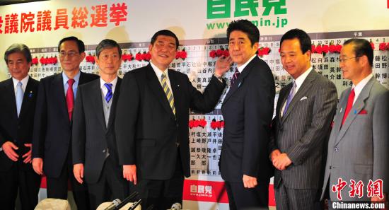 12月16日進(jìn)行投票選舉的日本第46屆眾議院大選,雖然最終選票結(jié)果要于17日凌晨統(tǒng)計(jì)完畢,但自民黨單獨(dú)獲得眾議院半數(shù)席位已經(jīng)意味著將重新執(zhí)政,而自民黨總裁安倍晉三將成為日本新首相。圖為12月16日,自民黨總裁安倍晉三(右三)和自民黨高層為當(dāng)選議員貼獲勝標(biāo)志紅花。中新社發(fā) 孫冉 攝