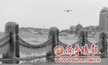 大浪拍上岸后,海水瞬間就被凍住,煙臺濱海廣場的鐵鎖鏈上形成長長的冰凌。本報記者 趙金陽 攝