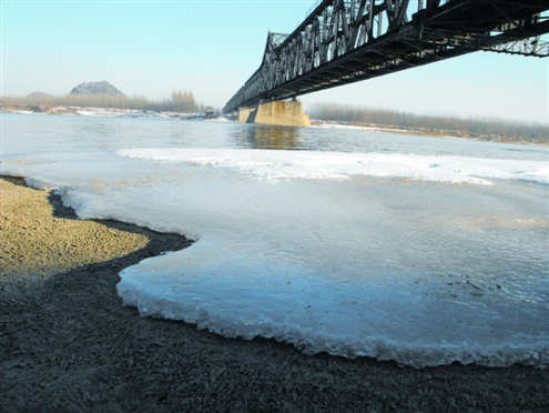 昨日,在黃河濟南濼口段,河岸淺水地帶開始結(jié)上厚厚的冰,并且河中出現(xiàn)“冰坨”現(xiàn)象 記者鄭濤攝