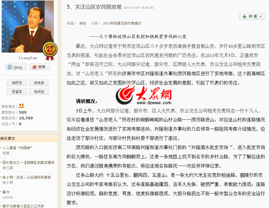 近日,大眾網(wǎng)關(guān)于“山貨大爺”的系列報道,引起社會各界對近郊山區(qū)農(nóng)民脫貧問題的廣泛關(guān)注。對此,濟南市人大代表梁凡說,他剛剛完成《關(guān)于幫助近郊山區(qū)農(nóng)村加快脫貧步伐的議案》,明天濟南市十五屆人大二次會議開幕后,將向大會提交,建議有關(guān)部門克服困難,幫助這個地區(qū)開通公交車,走上小康路。