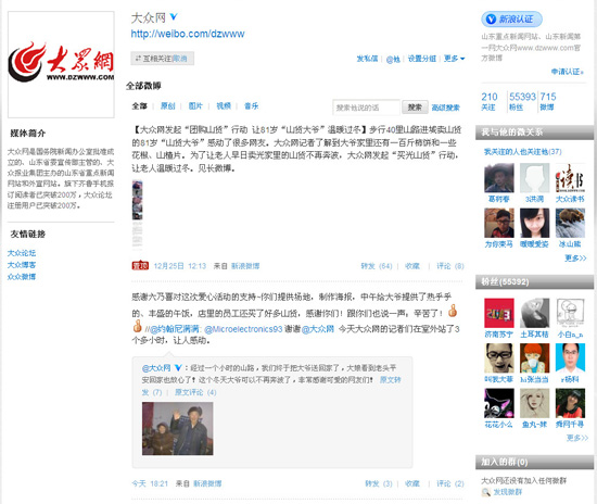 大眾網(wǎng)濟(jì)南12月27日訊記者 劉欣)55條原創(chuàng)微博、300余條微博評(píng)論、600余次微博轉(zhuǎn)發(fā)……這些數(shù)字是大眾網(wǎng)友們愛心的見證!今天,大眾網(wǎng)官方微博@大眾網(wǎng) 對(duì)愛心“團(tuán)購山貨”活動(dòng)進(jìn)行了全程微博直播,近100位網(wǎng)友通過微博號(hào)召大家購買愛心山貨,傳遞網(wǎng)絡(luò)正能量。