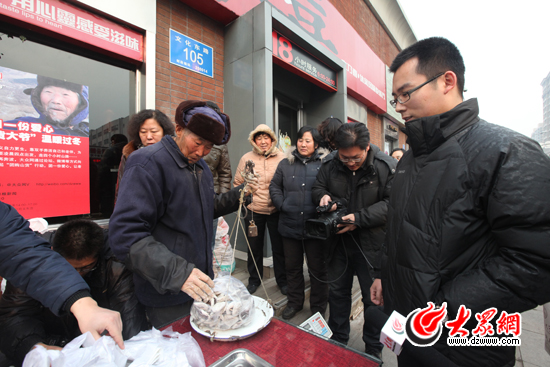 為了獻(xiàn)一份愛(ài)心,凌律師特意坐車(chē)從舜耕山莊來(lái)到了文化東路,下午2點(diǎn)就等在了六乃喜門(mén)口!拔以谖⒉┥纤叫臔大眾網(wǎng)了,不過(guò)怕來(lái)晚了買(mǎi)不到,還是自己跑一趟!彼f(shuō),最初知道“山貨大爺”是通過(guò)微博,這次是從@大眾網(wǎng) 上看到大眾網(wǎng)發(fā)布的“山貨團(tuán)購(gòu)”愛(ài)心活動(dòng)!拔矣X(jué)得這活動(dòng)十分好,就想過(guò)來(lái)支持一下‘山貨大爺’。正好今天下午有時(shí)間,就趕過(guò)來(lái)了!