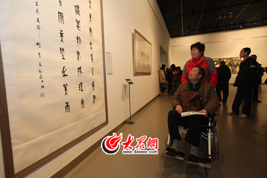 今天上午,在參觀大眾網(wǎng)主辦的“丹青頌”齊魯名家書畫巨制展的千余名市民當(dāng)中,有這樣一位坐著輪椅的特殊觀眾,他坐在輪椅上認(rèn)真欣賞著各位名家的書畫作品,還不時利用自己的書畫專業(yè)知識為現(xiàn)場觀眾進行講解,他就是濟南市民呂大偉。在本次展覽中他不僅近距離的觀賞了名家的書畫作品,更收到了一份特殊的禮物——由展覽主辦方大眾網(wǎng)贈送的“丹青頌”齊魯名家書畫作品集。
