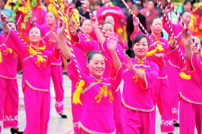 讓人民享有健康豐富的精神文化生活,是全面建成小康社會(huì)的重要內(nèi)容。圖為三峽壩區(qū)移民群眾演員表演民間舞蹈,喜慶十八大。