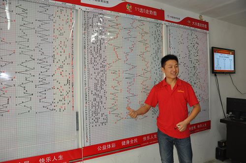 為了以最快、最好的技能滿足彩友的需求,小邱每日苦練打票手法,再看看小邱填寫的走勢(shì)圖,也稱的上是一絲不茍,走勢(shì)折線是用尺子畫出來的,而且紅筆黑筆分別加以標(biāo)注,清晰明了。