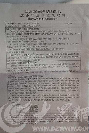 大眾網(wǎng)11月25日訊(記者 張帆 劉國棟)今天上午,記者輾轉聯(lián)系到負責龔鈺犇交通事故的臺兒莊區(qū)公安分局交通警察大隊事故處理中隊中隊長李玉龍,并且看到了道路交通事故認定書。目前,肇事車輛的駕駛員劉某已經(jīng)被逮捕,下一步公安機關將向法院、檢察院提請刑事附帶民事的公訴。