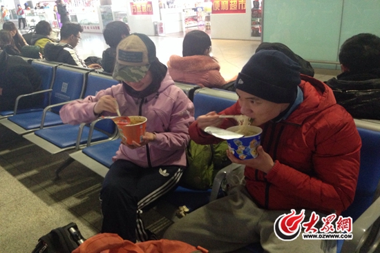 回家的路途漫長,但只吃泡面也覺得香。 大眾網(wǎng)記者 劉明明 攝