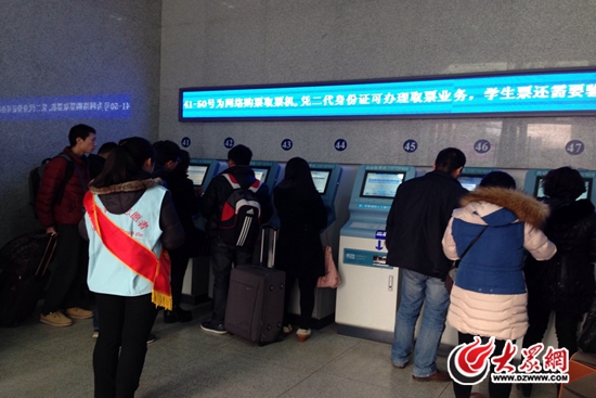 春運(yùn)期間,濟(jì)南站隨處可見穿著淺藍(lán)色或黃色背心的年輕人,他們有的在教旅客使用自動取票機(jī),有的在幫旅客提行李、指路。在攀談中記者了解到,他們分別來自濟(jì)南大學(xué)和中國志愿者協(xié)會。
