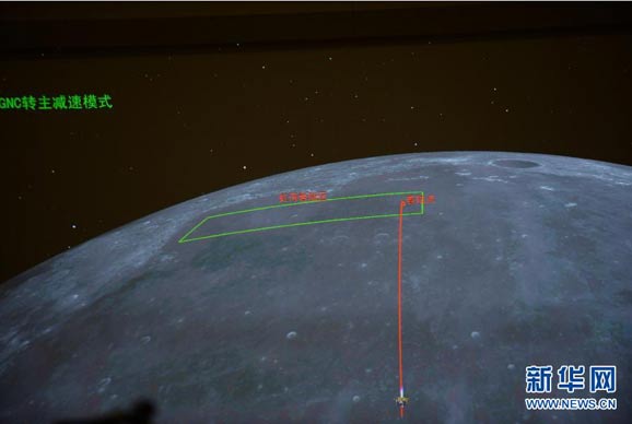 12月14日,嫦娥三號開始落月。探測器從距月面15公里處實施動力下降,相對速度將從每秒1.7公里逐漸減為0。這是北京飛行控制中心大屏幕上顯示的嫦娥三號探測器。新華社記者 李鑫 攝