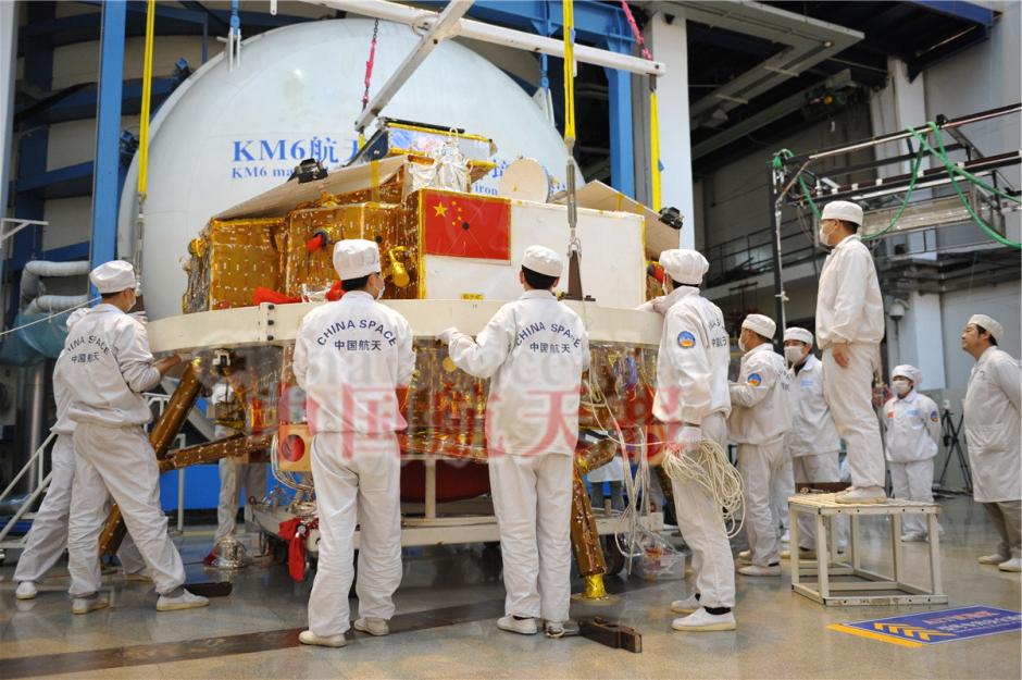 圖為2013年4月,在北京唐家?guī)X的五院衛(wèi)星總裝試驗(yàn)大廳(簡稱AIT大廳)內(nèi),五院總裝與環(huán)境工程部的試驗(yàn)人員們正在進(jìn)行嫦娥三號探測器的熱試驗(yàn)準(zhǔn)備工作,通過本次試驗(yàn)來最終確認(rèn)其能否忍受在奔月、落月過程中所要承受的嚴(yán)峻考驗(yàn)。(資料圖)圖片來源:中國航天報