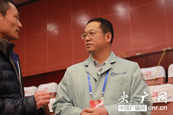 記者白宇在北京飛控中心采訪嫦娥三號任務(wù)測控系統(tǒng)專家宋軍(右) 央廣網(wǎng)記者朱虹 攝