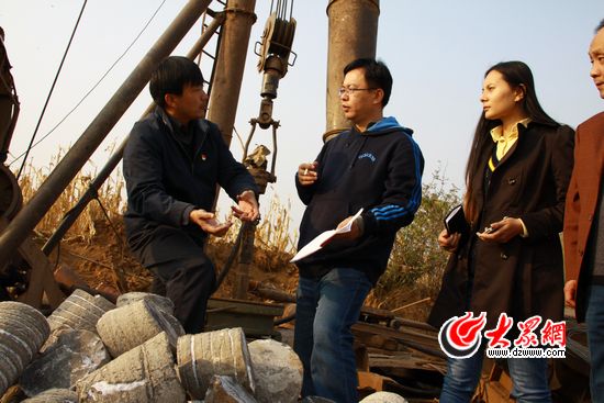 來自食品醫(yī)藥監(jiān)督管理局的“第一書記”王洪坤向大眾網(wǎng)記者介紹東平縣梯門鎮(zhèn)的地質(zhì)結(jié)構(gòu)。記者 張帆 攝