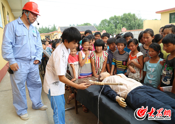 供電職工利用橡膠人現(xiàn)場(chǎng)指導(dǎo)學(xué)生解救觸電者