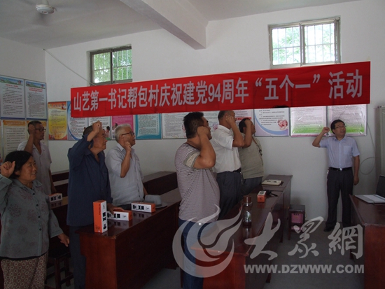 為增強(qiáng)幫包村黨組織的凝聚力、向心力和戰(zhàn)斗力,強(qiáng)化農(nóng)村黨員組織觀念,進(jìn)一步發(fā)揮基層黨支部戰(zhàn)斗堡壘作用和黨員先鋒模范作用,山東藝術(shù)學(xué)院新一輪第一書記工作組開展了“觀看一部紅色電影、召開一個(gè)黨員座談會(huì)、重溫一遍入黨誓詞、開展一次黨員義務(wù)勞動(dòng)、慰問(wèn)一批老黨員”的“五個(gè)一”系列活動(dòng),慶祝中國(guó)共產(chǎn)黨成立94周年。