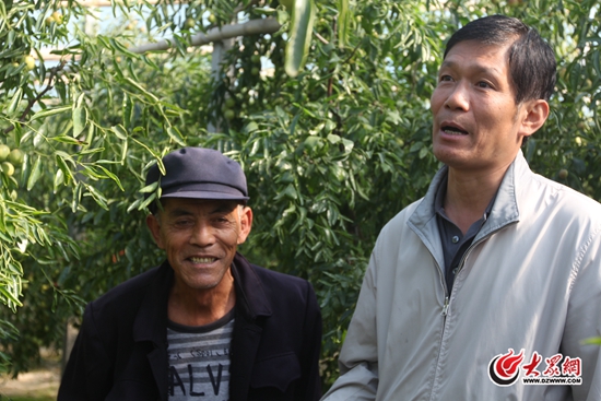 在“第一書(shū)記”丁立臣(右)的幫助下,家里有了冬棗大棚,朱榮章(左)大爺高興地合不攏嘴