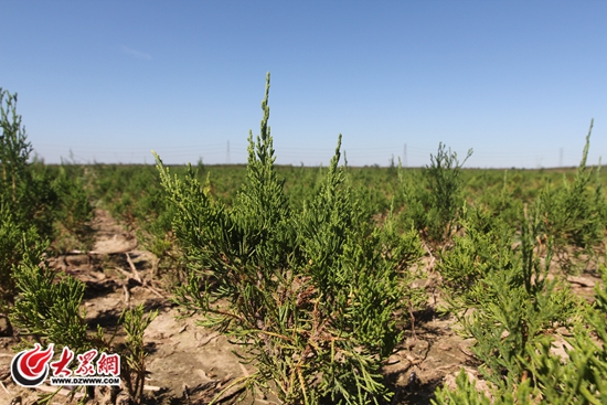 沾化以冬棗聞名全國,但在該縣的大樓鎮(zhèn)韓家糖坊村,卻很少能見到冬棗樹,這里種的最多的是龍柏。9月25日中午,大眾網(wǎng)記者在村里的百畝龍柏示范園前,看到綠油油的龍柏苗一眼望不到邊,而這個當(dāng)?shù)睾苌僖姷摹跋『蔽铩笔菫I州醫(yī)學(xué)院總務(wù)處的副處長——“第一書記”雋博永引進來的“發(fā)財樹”。