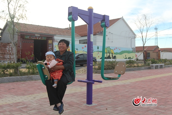 東李村村民丁金榮坐在標(biāo)準(zhǔn)化健身路徑上看孫子