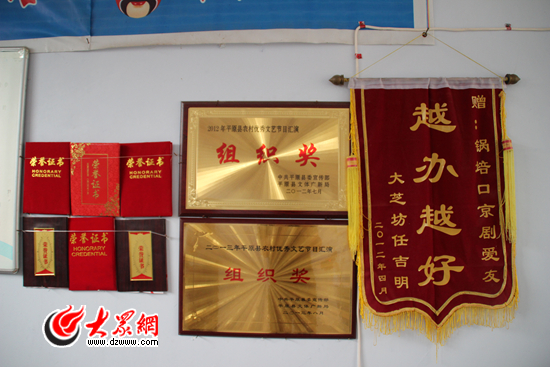 腰站鎮(zhèn)鍋培口村的京劇社越辦越好,“草臺(tái)班子”拿到的榮譽(yù)掛滿了墻。記者 滿志旺 攝