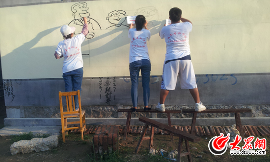 山東藝術(shù)學(xué)院大學(xué)生冒著酷暑在為村子描繪“文化墻”