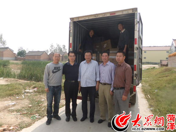 山東師大派駐東明縣菜園集鎮(zhèn)“第一書記”后衙村戰(zhàn)秉聚(右二)、祥寨村譚效忠(左一)等將山東師大二附中捐贈的價值48萬元的112臺液晶電腦送到了后衙村小學