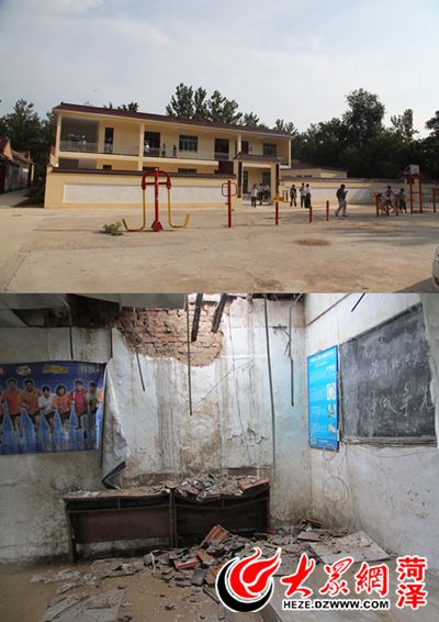 新建成的東田樓村黨員活動(dòng)室和健身廣場(chǎng)(上)與原先已經(jīng)坍塌的東田樓黨員活動(dòng)室內(nèi)景對(duì)比