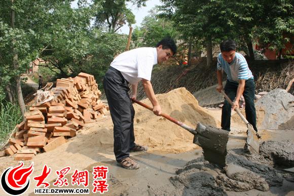 “第一書記”孫峰(左)在空余時間也在施工現(xiàn)場幫忙