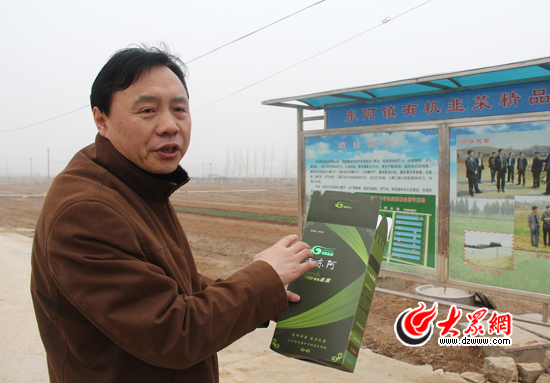 趙延波向記者村里新推出的老東阿牌有機(jī)韭菜。