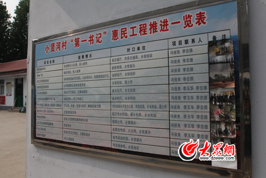 在小賢河村委會(huì)公布的“惠民工程推進(jìn)一覽表”上,硬化路面、農(nóng)田灌溉、通自來水等多項(xiàng)工程都列出了時(shí)間表。