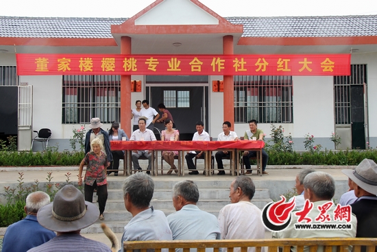 大眾網(wǎng)日照9月23日訊(記者 李佩強 張希嘉)“五張掉漆的木桌”、“一條劣質(zhì)的條幅”、“一群踢踏著拖鞋的農(nóng)民”、“一聲手機發(fā)出的最弦民族風(fēng)鈴聲”、“一張張嶄新的儲蓄存單”,這些與城市完全不同的景象,是9月22日下午記者在大耳山櫻桃專業(yè)合作社的分紅大會上看到的。這個位于山東省五蓮縣叩官鎮(zhèn)董家樓村,以櫻桃銷售為主的合作社,在2013年經(jīng)歷了一場暴風(fēng)雨對櫻桃的洗劫。盡管如此,村民臉上并沒有透露出一絲愁悶,因為櫻桃仍然賣得相當(dāng)好,這要歸功于“第一書記”袁志華對櫻桃電子商務(wù)化的推動。