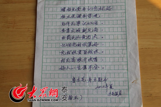 梯門鎮(zhèn)花店村的一位普通村民寫給“第一書記”楊見奎的藏頭詩。(實習生 刁云龍 攝)