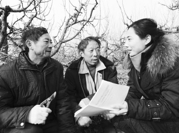 2012年12月12日,棗莊市山亭團(tuán)區(qū)委派駐店子鎮(zhèn)苑莊村“第一書(shū)記”高曉娟(右)在果園向農(nóng)民宣傳十八大精神。10多年了,黃溝村一直沒(méi)有黨員納新對(duì)象,村支部不健全,黨員活動(dòng)一年搞不了一次,一直是鎮(zhèn)里的三類(lèi)落后班子。
