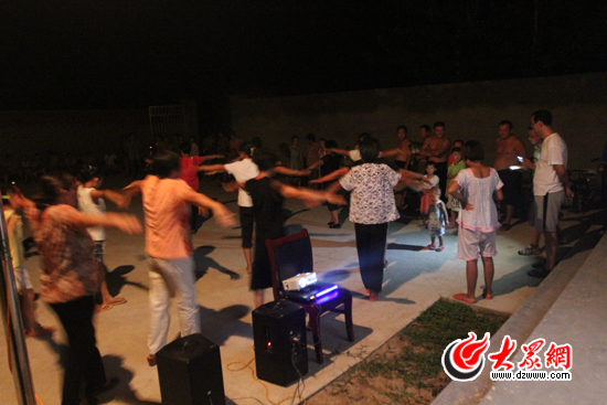 42歲的村民劉祥龍抽著自己卷的旱煙,瞇著眼吐出一個(gè)不圓的煙圈,他妻子馮貴芬也在跳舞的隊(duì)伍里,只要不下雨,天天都來(lái)跳。以前兩口子干完農(nóng)活回到家,吃了晚飯就睡覺(jué),這兩個(gè)月以來(lái),妻子天天拉著他來(lái)看,不大懂女人心思的老劉看了好幾天才明白過(guò)來(lái):原來(lái)妻子穿上那條黑色連衣裙還是挺漂亮的!那是前幾年給妻子買的,平時(shí)在家很少有合適的場(chǎng)合穿,現(xiàn)在天天穿上來(lái)跳舞,看著效果還不錯(cuò)!皼](méi)想到咱老農(nóng)民也能參加個(gè)舞會(huì)了,嘿嘿,不孬!”。