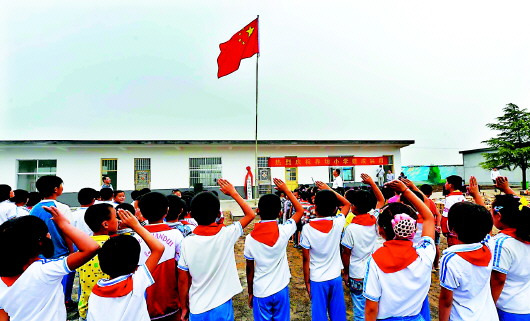 今天,界坊小學(xué)第一次升起了國旗(左圖)。這個(gè)村3年級(jí)以下的孩子在家門口就可以坐在寬敞明亮的教室里學(xué)習(xí)知識(shí),再也不用跑到三四公里之外的小學(xué)就讀。不僅如此,孩子們還得到了圖書、書包、教具、玩具等大宗“禮物”。