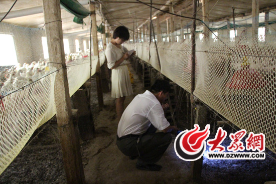 在養(yǎng)雞場(chǎng),魏祥法查看雞糞,判斷雞的病情