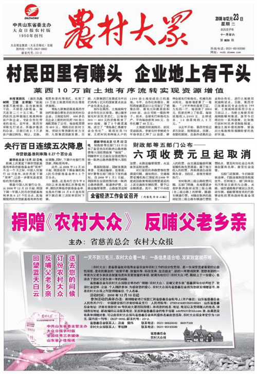 農(nóng)村大眾報(bào)始終定位于服務(wù)農(nóng)業(yè)、農(nóng)村、農(nóng)民,以“黨報(bào)的權(quán)威,生活報(bào)的趣味,科技報(bào)的信息,專業(yè)報(bào)的嚴(yán)謹(jǐn)”為主旨,大膽創(chuàng)新,策劃實(shí)施了一系列重大的新聞報(bào)道及公益活動(dòng),發(fā)揮了“指導(dǎo)全省農(nóng)村工作重要輿論陣地”的作用,被譽(yù)為農(nóng)民朋友的政策手冊(cè)、致富向?qū)、科技寶典、生活益友。目?SPAN>,發(fā)行量20萬份,在全國(guó)農(nóng)村報(bào)陣營(yíng)中,已經(jīng)形成“南有南方農(nóng)村報(bào),北有農(nóng)村大眾報(bào)”的南北雙雄格局,是“全國(guó)優(yōu)秀三農(nóng)媒體”,聯(lián)合國(guó)教科文組織登記注冊(cè)的兩家山東報(bào)紙之一。