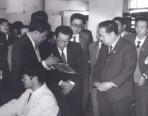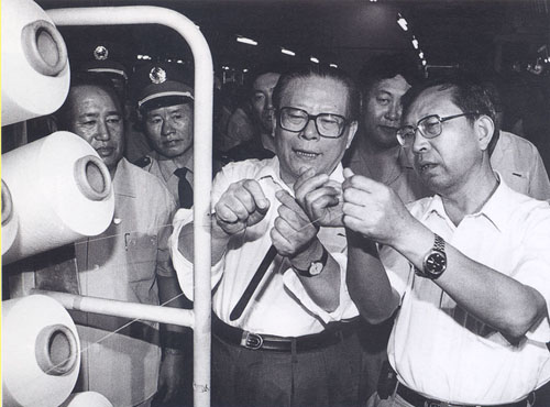 江澤民同志1992年7月2日至31日在山東視察,這是他7月25日在煙臺(tái)經(jīng)濟(jì)技術(shù)開發(fā)區(qū)深入車間考察(王瑞華 攝)