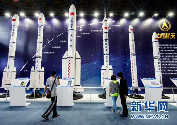 觀眾在第十六屆中國(guó)北京國(guó)際科技產(chǎn)業(yè)博覽會(huì)航天科技專(zhuān)題展區(qū)參觀我國(guó)長(zhǎng)征系列運(yùn)載火箭的模型。新華社記者 羅曉光 攝