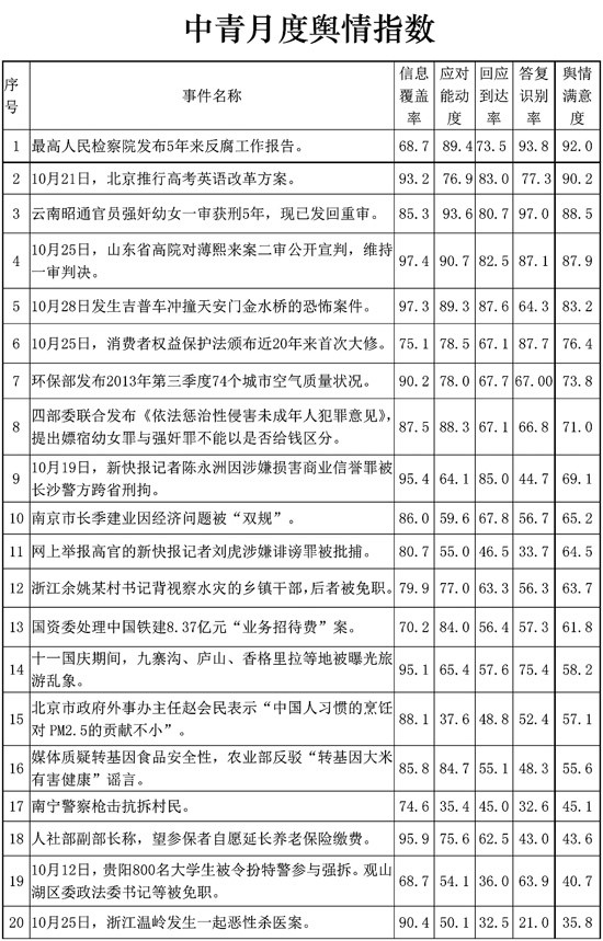 本期輿情指數(shù)中,最高人民檢察院公布5年反腐工作報告、北京市試水中高考英語改革方案、“云南昭通官員強奸幼女案”發(fā)回重審,分別位居綜合滿意度前3名。