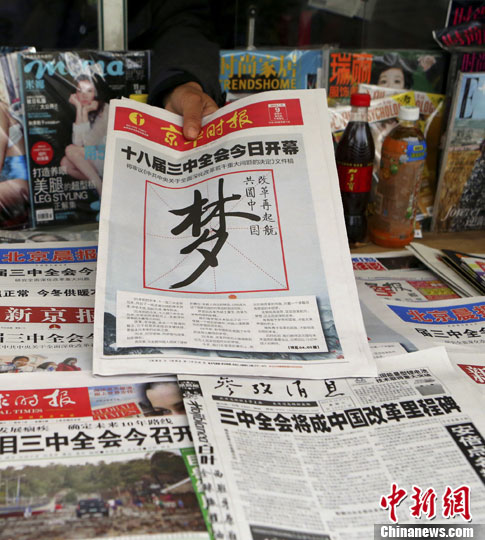 11月9日,北京一個報攤上,多家報紙的頭版都報道了十八屆三中全會當天開幕這一消息。中新社發(fā) 李慧思 攝