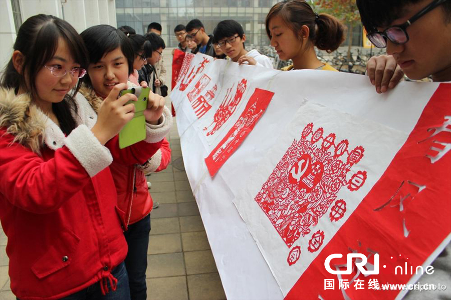 11月9日,在山東聊城大學(xué),大學(xué)生志愿者們?cè)谡故緞?chuàng)作的剪紙作品,以慶祝黨的十八屆三中全會(huì)的召開(kāi)。