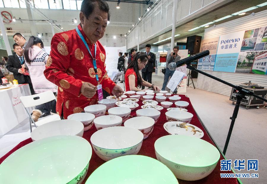 參加第八屆中國(guó)北京國(guó)際文化創(chuàng)意產(chǎn)業(yè)博覽會(huì)的人員在文博會(huì)上用瓷碗演奏樂(lè)曲(2013年11月7日攝)。